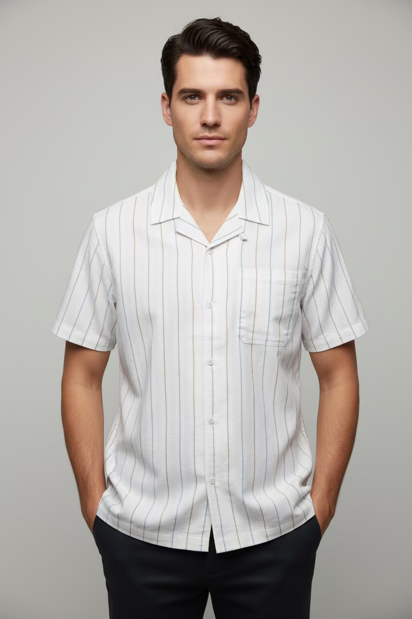 Elevate your warm-weather wardrobe with this classic short sleeve button-up camp shirt. The crisp ivory and aqua stripe pattern brings a timeless, relaxed aesthetic perfect for casual outings, weekend getaways, or layering over your favorite tee. Crafted for comfort and style, this versatile piece transitions seamlessly from day to night. The structured button-up front and traditional camp collar design offer a polished look without sacrificing breathability. An essential addition to any man's collection.
