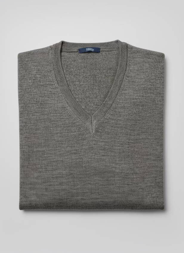This refined V-neck pullover blends 50% wool with 50% polyester-cotton for a versatile layering piece that delivers both warmth and breathability. The wool component provides natural insulation and moisture-wicking properties, while the polyester-cotton blend ensures durability and easy care. The classic V-neck silhouette works seamlessly over dress shirts or as a standalone layer, making it an essential addition to any professional wardrobe. Available in assorted colours to complement your existing collection.