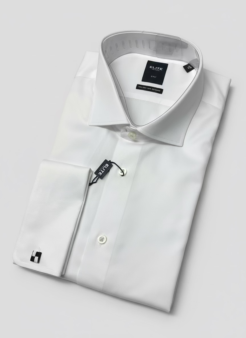 Elevate your formal wardrobe with this premium white dress shirt, crafted from 100% cotton for superior breathability and comfort. The French cuff design adds sophisticated elegance to any business or black-tie occasion, while the non-iron finish eliminates the need for pressing, saving you valuable time. The crisp cotton fabric maintains its shape and appearance wash after wash, making this a reliable investment piece for the discerning gentleman. Perfect for boardroom meetings, weddings, or refined evening events.